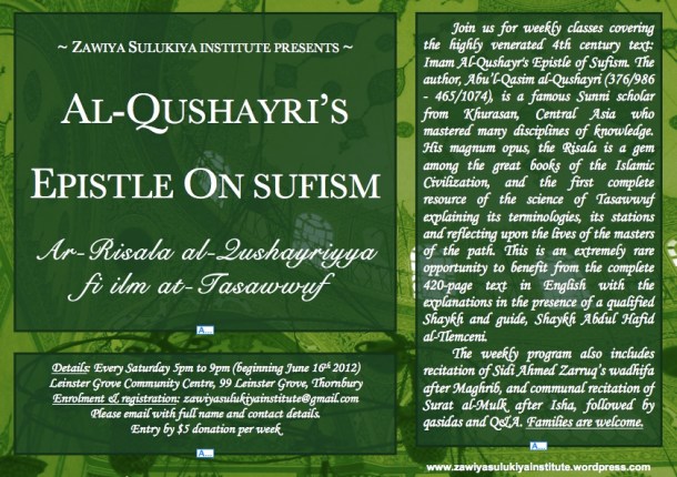 In preparation for this, the Zawiya Sulukiya Institute invites the community to Saturday evening classes of Imam Al Qushayri’s magnum opus, Epistle of Sufism (Risala fi ilm at Tasawwuf) – the very first complete manual written in the science of Tasawwuf. This is an extremely rare opportunity to cover the entire 420 page text with explanations in English, as taught by a qualified Shaykh and guide, Shaykh Abdelhafid Al-Tlemceni (Abu Mouaiz). The weekly program also includes recitation of Sidi Ahmed Zarruq’s wadhifa after Maghrib, and communal recitation of Surat al-Mulk after Isha. This is followed by qasidas and a session of Q&A for the benefit of the wider community. Families are welcome to attend.